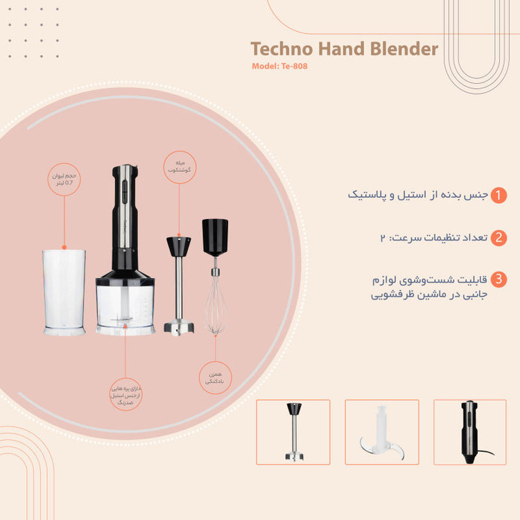 یکی از لوازم خانگی که در سالهای اخیر استفاده از آن رواج بیشتری یافته گوشتکوب برقی است. این وسیله پرکاربرد میتواند در ایجاد تنوع در منوی غذایی شما و همچنین راحتتر و سریعتر کردن آشپزی به شما کمک کند. گوشتکوب برقی «تکنو» مدل «Te-808» از جمله محصولات کاربردی این برند است که طراحی ساده و بدنه سبکی دارد. این دستگاه دارای عملکرد چندکاره است. به این معنا که علاوه بر میله گوشتکوب برقی، یک دسته همزن، یک ظرف خردکن و یک لیوان مخصوص نیز به همراه آن به کاربر ارائه میشود. این مدل دارای دو دکمه روی قسمت دسته است که از طریق آنها سرعت دستگاه تنظیم میشود. دو سرعت مختلف برای این گوشتکوب برقی در نظر گرفته شده است که با توجه به نیاز خود هر کدام از آنها را میتوان انتخاب کرد. لیوان همراه این دستگاه دارای حجم 0.7 لیتر است. تیغههای این دستگاه و همچنین پایه گوشتکوب آن از جنس مقاوم استیل است که در برابر زنگزدگی مقاوم هستند. اگر شما هم از صدای زیاد برخی دستگاههای برقی خوشتان نمیآید این مدل انتخابی مناسب برای شماست. موتور دستگاه از نوع کمصداست و نویز زیادی تولید نمیکند، بنابراین میتوانید بدون بر هم زدن آرامش خانه از آن استفاده کنید. یکی دیگر از ویژگیهای کاربردی این مدل امکان خردکردن یخ است تا هرگاه دوست داشتید یک نوشیدنی یخی و خنک میل کنید به کمک شما بشتابد.