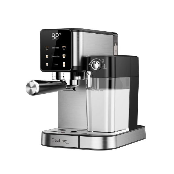 اسپرسوساز تکنو مدل Te-822 طراحی شیک و مدرنی دارد که از جنس استیل ضد زنگ است و با کیفیت بالا ساخته شده است. این دستگاه ابعادی جمع و جور دارد و فضای کمی را اشغال می کند. مخزن آب 1.5 لیتری و مخزن شیر جداگانه دارد که استفاده و شستشوی آنها را آسان می کند. صفحه نمایش لمسی و دکمه های فشار رابط کاربری ساده و روانی را به دستگاه می دهد.