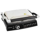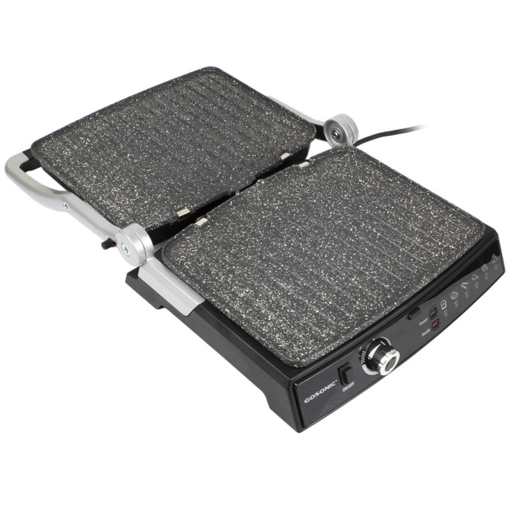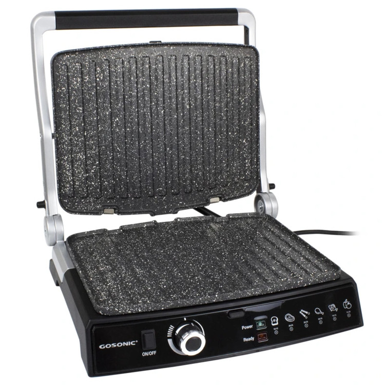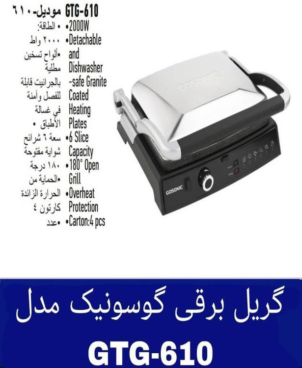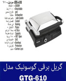 گریل گوسونیک مدل GTG-610 از نوع Contact Grill می باشد. این نوع گریل ها به دلیل اینکه ماده غذایی از دو طرف گرما داده میشود به این نام شناخته می شوند. اما این گریل فقط عملکرد نوع Contact را ندارد و به وسیله دکمه ای در انتهای دستگیره آن، قابلیت استفاده به صورت 180 درجه ای را دارد؛ درست همانند گریل های معمولی. در این حالت شما جای بیشتری برای قرار دادن مواد غذایی خواهید داشت و همچنین میتوانید به نحوه و میزان پخت نظارت داشته باشید. صفحات این گریل دارای روکش گرانیت نچسب و ضدخش است که قابل جدا شدن و شستشو در ماشین ظرفشویی می باشد. گریل گوسونیک مدل GTG-610 دارای تنظیمات کنترل دما می باشد که می توانید بسته به نوع ماده غذایی، بوسیله کلید ولومی دما را انتخاب کنید. بر روی این گریل دو چراغ نشانگر برای اماده به کار بودن و همچنین روشن/خاموش بودن دستگاه تعبیه شده است. در پایان قابل ذکر است که این دستگاه 2000 وات توان مصرفی دارد.