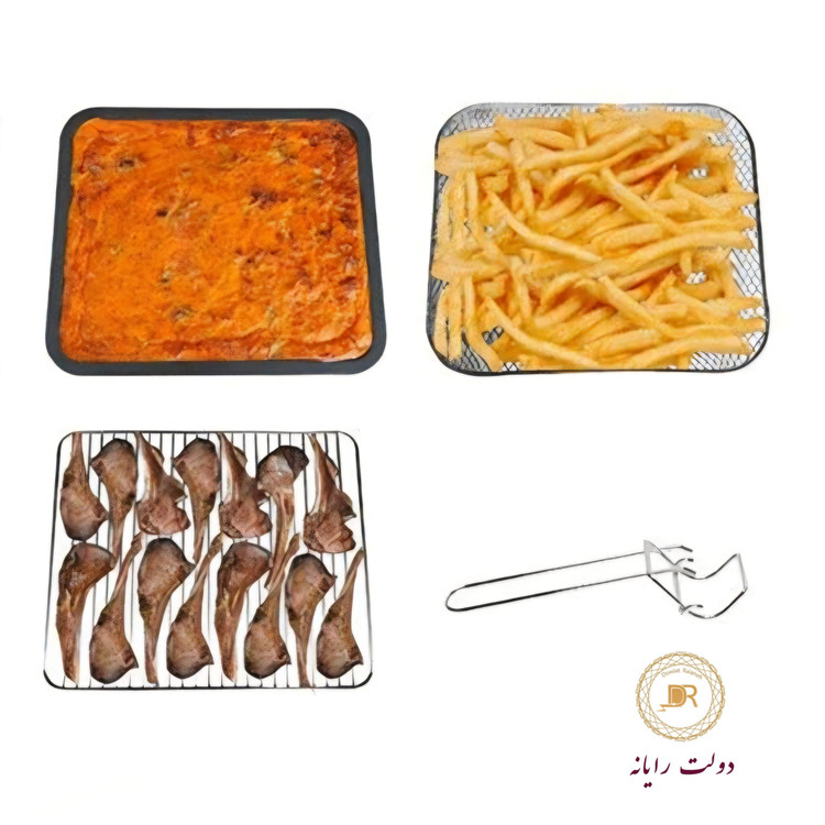 دریچه قسمت پایین دستگاه باز شو جهت نظافت راحت تر، دارای ۳ عدد سینی جهت پخت و پز، گیره مجزا جهت خارج کردن سینی ها، دارای لامپ داخلی