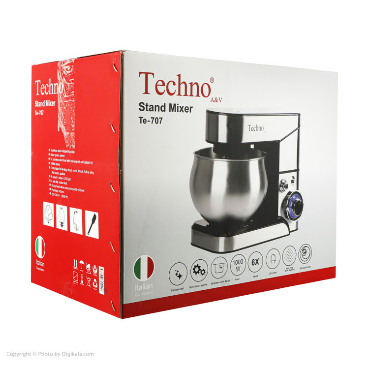 همزنهای برقی ازجمله وسایل کاربردی خانه هستند که معمولاً در دو نوع پایهدار و بدون پایه تولید میشوند. همزن مدل « Te-707» یکی از محصولات کاربردی ساخت برند «تکنو» است که از نوع همزنهای پایهدار است. این مدل مانند دیگر محصولات برند تکنو، از طراحی ساده و ارگونومیک برخوردار است و با یک کاسه استیل همراه شده است. جنس بدنەی آن از پلاستیک فشرده مقاوم با توان موتور 1000 وات فوق العاده قوی و بادوام را داراست. این همزن دارای قابلیت تنظیم سرعت است و به شما این امکان را میدهد تا سرعت این مدل را در 6 حالت تنظیم کنید. ظرفیت این محصول نیز مناسب است. همزن Te-707 با سه سری مخصوص ارائه شده است که علاوهبر همزدن یا میکسکردن، از قابلیت خمیرزنی و همچنین ورز دهنده نیز برخوردار است، تا دست آشپز را در تهیه و پخت غذاهای مختلف باز نگه دارد. کاسه استیل ضدزنگ دستگاه کاملا در محل خود قفل می شود و حین کار دستگاه هیچ لرزشی احساس نمی شود و پس از اتمام کار، کاسه بازشده و قابل شستشوی دستی و ماشینی است.